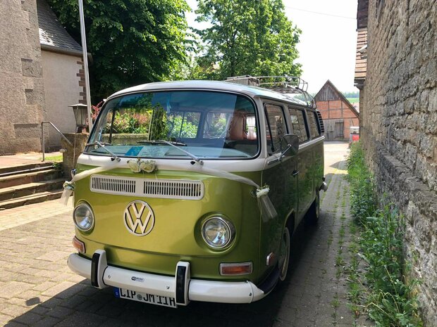 Steigen Sie ein in den legendären VW T2 Bulli und erleben Sie Retro-Charme auf der Fahrt zu Ihrem großen Tag. Mit seinem einzigartigen Design und zeitlosem Flair wird jede Fahrt zu einem besonderen Moment voller Freude und Romantik. Genießen Sie Ihre Fahrt ins Glück in einem besonderen Ambiente.