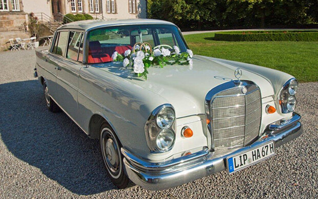 Steigen Sie ein in den eleganten Mercedes W111 230S von 1967 in strahlendem Paypyrusweiß und lassen Sie sich stilvoll zu Ihrem großen Moment chauffieren. Das klassische rote Interieur, gekühlte Getränke und eine entspannte Atmosphäre schaffen unvergessliche Momente zu Zweit - pure Romantik auf Rädern.